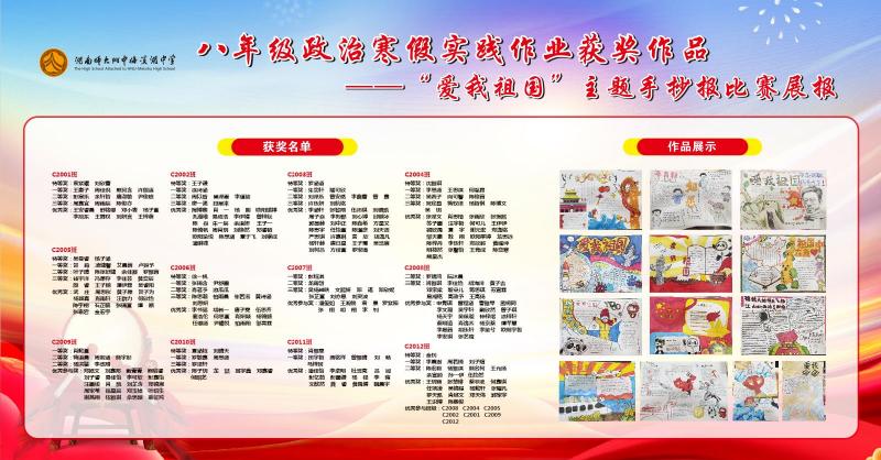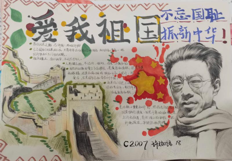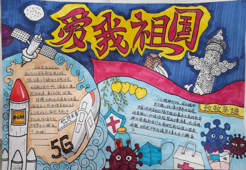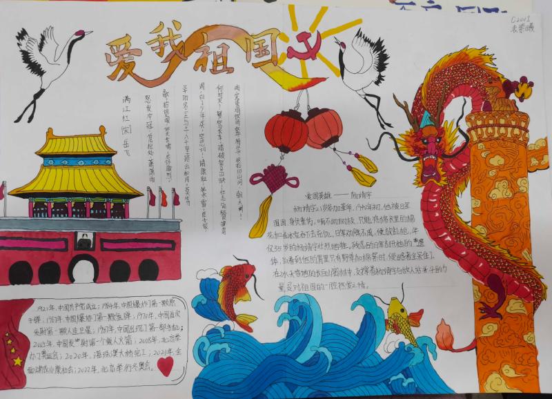 八年级各班高度重视此项工作,班主任积极对手抄报制作进行指导。活动中,同学们踊跃参与,饱含热情,认真搜集资料,以“爱我祖国”为主题精心构思,从我国优秀传统文化、中华民族精神、冬奥会和近年来取得的重大科技成就等不同角度进行设计,充分发挥自己的聪明才智,绘制出一幅幅图文并茂、感情浓烈的优秀作品。作品各具特色、主题鲜明、构思精巧、色彩清丽,较好地实现了思想性和艺术性的统一,充分锻炼了学生排版、书写、美工等多方面的能力。