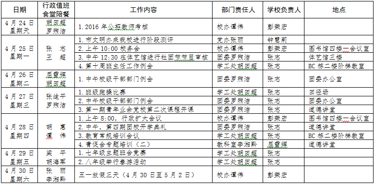 其他:周一周二审核小升初材料;周三上午送小升初材料去岳麓区教育局;周四下午到周六高中年级期中考试;初升高特长生招生筹备工作;周二至周五全校公物大检查;2016年政府采购项目申报;学业水平考试考点建设项目申报;督导工作:抽查教师教案。