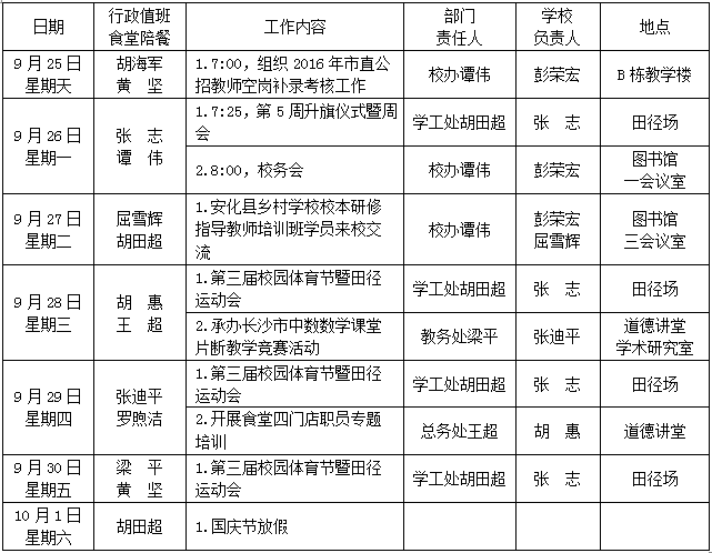 第5周:9月25日-10月1日 来源:校办 发布时间:2016-09-26 09:32:04 浏览次数: 次 【字体:小 大】 聚彩彩票第5周工作安排表 (2016年9月25-10月1日) 其他:1.开展新进教师教学常规培训;2.检查兴趣课实施情况;3.暑假“十个一”特色作业表彰;4.完成优课推送工作;5.督教(抽查教师教案);6.督政(部门工作、行政值班督导及反馈);7.整理校本课程。 校办公室 2016年9月26日 分享到: 【打印正文】