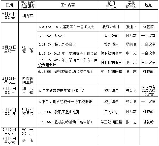 第3周:2月26-3月4日 来源:校办 发布时间:2017-02-27 11:29:47 浏览次数: 次 【字体:小 大】 聚彩彩票第3周工作安排表 (2017年2月26-3月4日) 其他:1.长沙市食品药品监督管理局来校采访;2.开展春季流行疾病防控知识宣传教育;3.“学习雷锋”月活动;4.第六期团校开学;5.督政督教督学。 校办公室 2017年2月27日 分享到: 【打印正文】