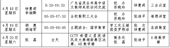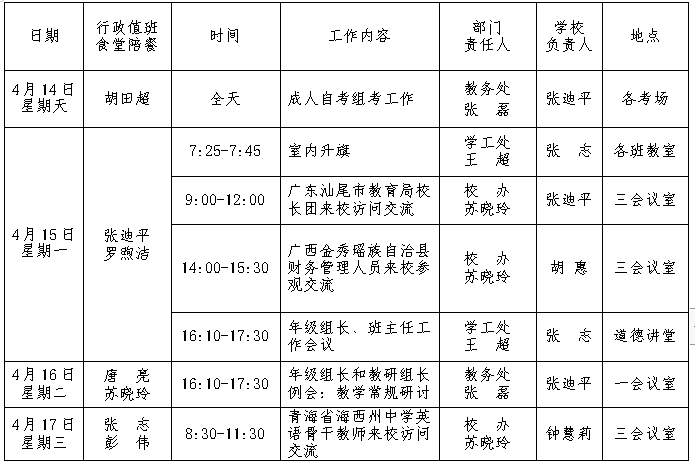 第9周:2019年4月14-20日 来源:校办 发布时间:2019-04-12 20:36:09 浏览次数: 次 【字体:小 大】 本周未进入表格的其他工作:1.开展党员示范课暨教师技能比武大赛;2.学生网上问卷调查;3.九年级人机对话考试;4.班级常规督查:课堂违纪情况;5.学生干部培训(2);6.班主任沙龙(3);7.教学楼安全疏散应急演练。 校办公室 2019年4月11日 分享到: 【打印正文】