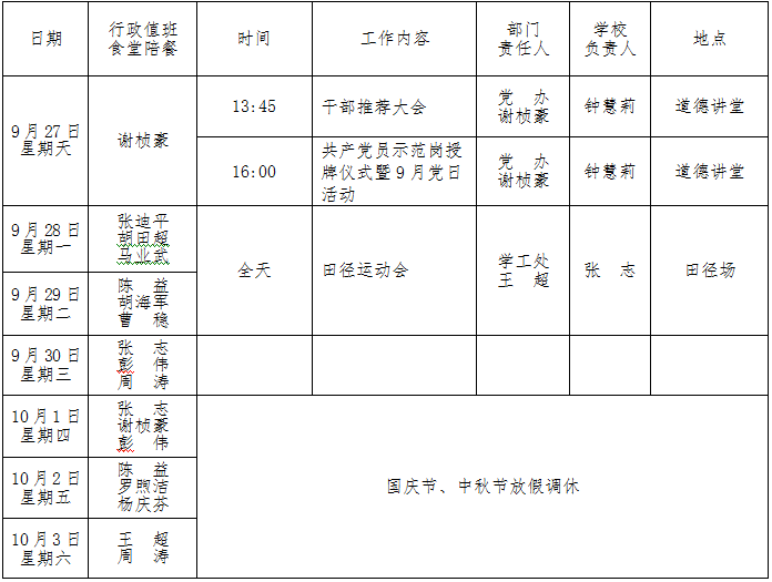 第5周工作:2020年9月27-10月3日 来源:校办 发布时间:2020-09-27 10:56:55 浏览次数: 次 【字体:小 大】 聚彩彩票2020-2021学年度第一学期 第5周工作安排表 (2020年9月27-10月3日) 校办公室 2020年9月25日 分享到: 【打印正文】