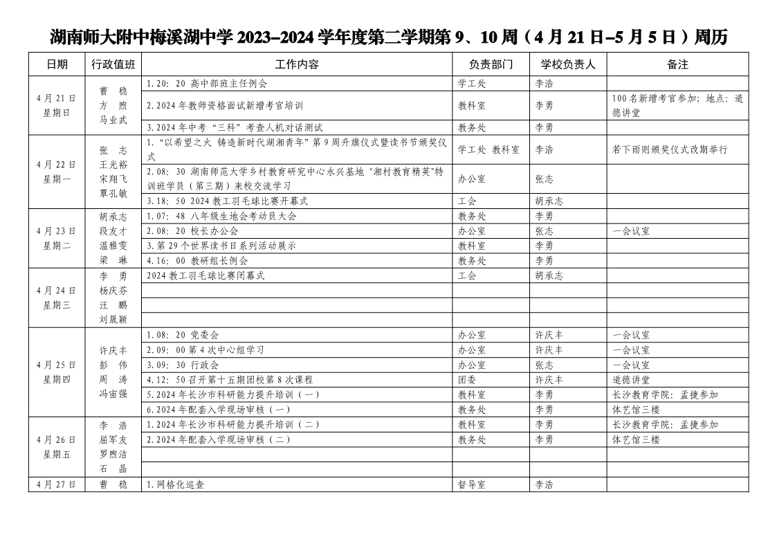 2023-2024学年度第二学期第9、10周周历