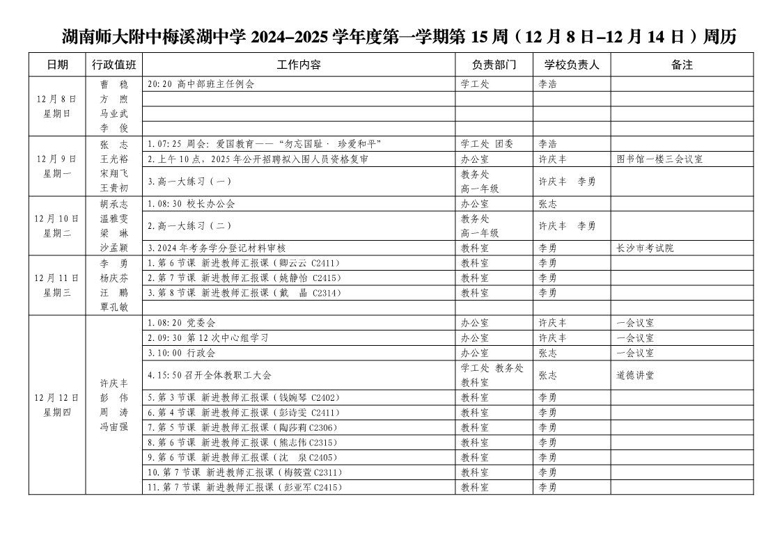 2024-2025学年度第一学期第15周周历