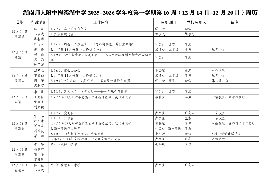 2025-2026学年度第一学期第16周周历