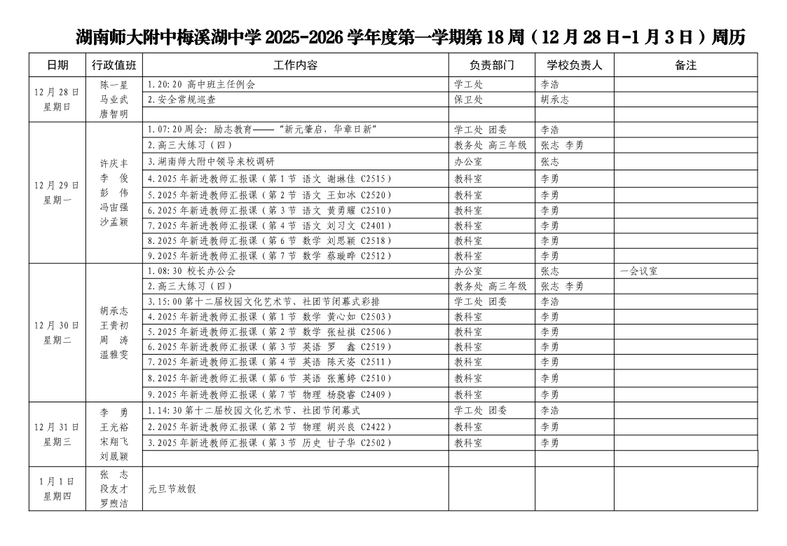 2025-2026学年度第一学期第18周周历